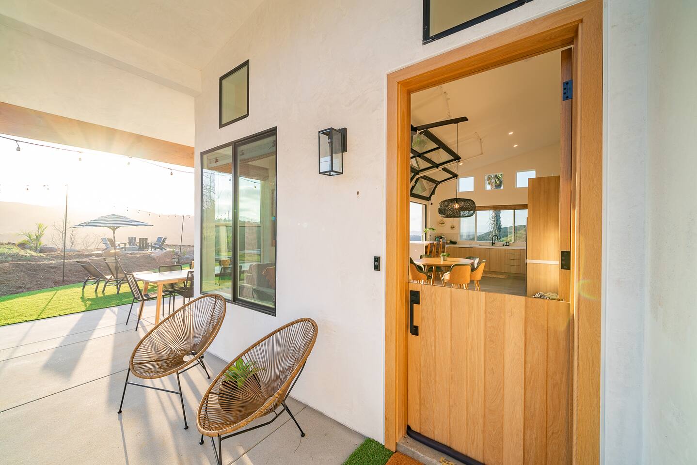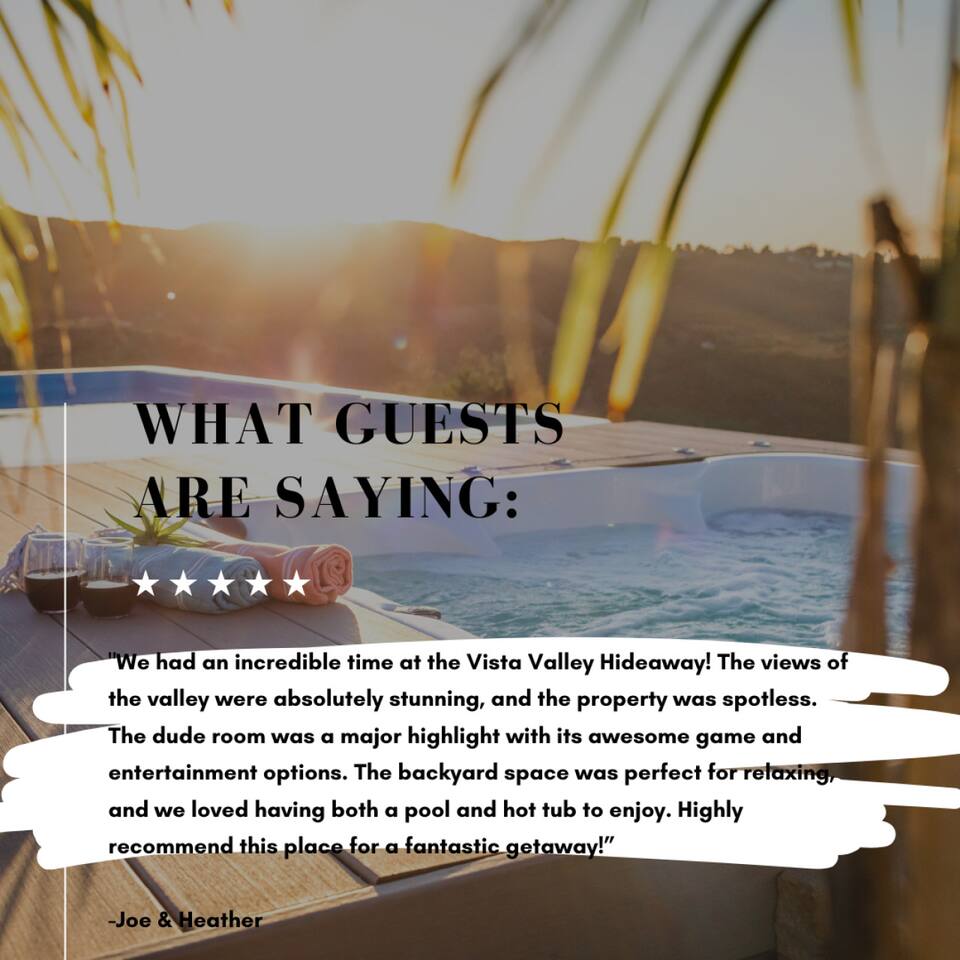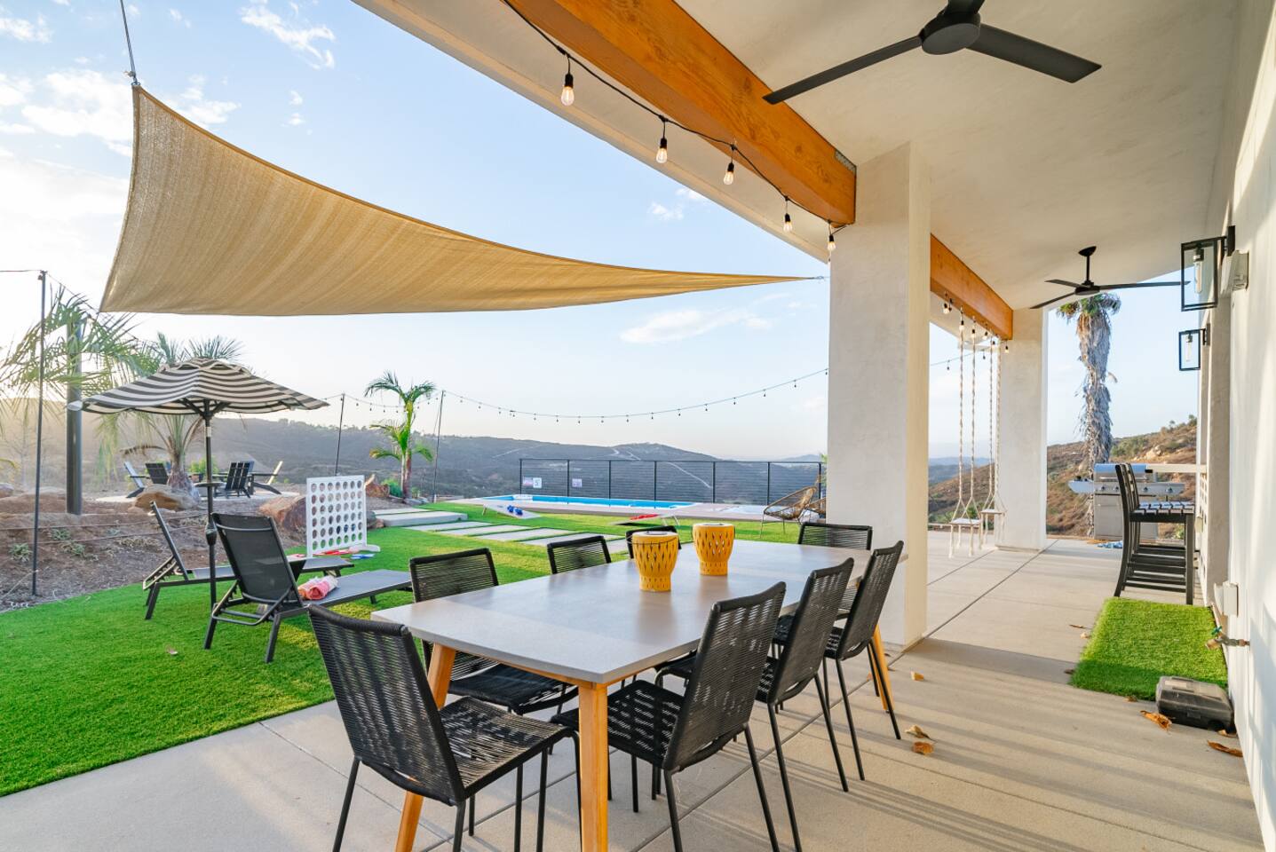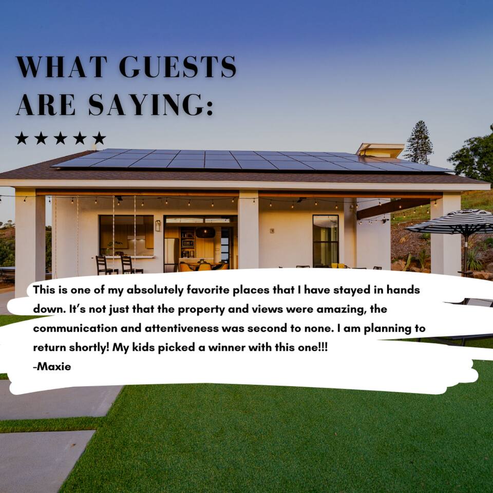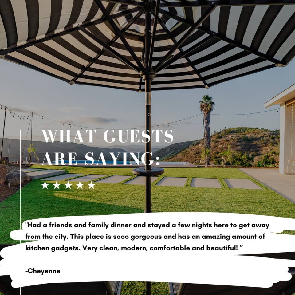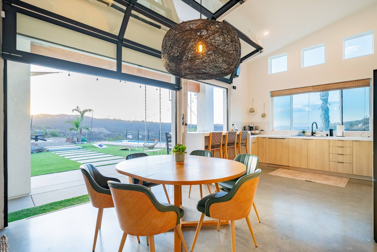 The Hideaway is where luxury meets nature, experience a truly unique retreat at our Vista property. Nestled away from the noise and stress of daily life, yet 15 minutes to amenities, this peaceful getaway is perfect for nature lovers and those in search of serenity. Escape the everyday and reconnect with the stunning beauty of the outdoors. It’s the ultimate “get away from it all” destination! *Can be booked with our 2 person unit on the same property for a total of 12 guests* (Inquire for details) **Featured on TV!** Vista Valley Hideaway caught the eye of real estate producer, Ty Hines, and our property was featured on SD Luxury Listings TV! Step inside and take in breathtaking panoramic views from the moment you arrive. The living room is a true showstopper, featuring a roll-up glass door that blurs the line between indoors and out—letting that perfect California sunshine and breeze flow right in. Outside, unwind on the covered patio, dive into the heated pool (kept at a comfy 78+-° during peak season at no extra charge, April–Oct, but can be heated during winter months for a small daily fee), or gather around the fire pit for starlit evenings and alfresco dining. Just 15 minutes from downtown, this pet-friendly oasis offers the perfect mix of relaxation, nature, and easy access to local fun. This open concept design allows people in the kitchen to connect with everybody in the dining area, living rooms, and even the outdoor spaces. Want to make a special meal for all of your guests? Enjoy all the amenities that this chef’s kitchen offers! Want to pass some appetizers out to the guests outside- no problem! The “pass through” servery kitchen window brings function and beauty to the space. You can choose to eat at the dining room table that seats 6, the servery window with bar stool seating that sits 6, and steps away you can take in the gorgeous views under the covered patio with an outdoor table that seats 8. This spacious vacation home offers three beautifully appointed bedrooms that all include 45” televisions. The master bedroom suite boasts a luxurious king-size bed, offering a regal night's sleep where you wake up to the beautiful surrounding mountain views! Take your freshly brewed cup of coffee right outside through the master bedrooms sliding glass doors and enjoy the outdoor furniture accompanying your bedroom suite. The en-suite master bathroom features a dual vanity, luxurious modern shower, and toilet room. The second bedroom features a comfortable queen-size bed, and the third bedroom is perfect for families with a full-size bunk bed that sleeps 4 children (or 2 adults) and a pullout twin trundle bed which sleeps 1 more, providing a cozy and efficient sleeping space. But the magic of this space extends beyond the bedrooms. Our living room and game room are versatile areas for relaxation and entertainment. Need extra sleeping options? No problem. The living room and game room both have pull-out queen-size sofa beds and we also have a full size air mattress. We can accommodate a total of 8 guests on the property comfortably. The game room, aka The Big Lebowski “Dude room”, features a pool table, Pac-Man machine, PlayStation 5, and board games; adding an extra layer of entertainment to your stay. And for the ultimate in relaxation, don't forget to unwind in the hot tub and pool, taking in the breathtaking surroundings. You'll love this private space! What are you waiting for? Come experience the perfect balance of nature and luxury at our Vista property today, where you can escape from it all and create memories to last a lifetime!