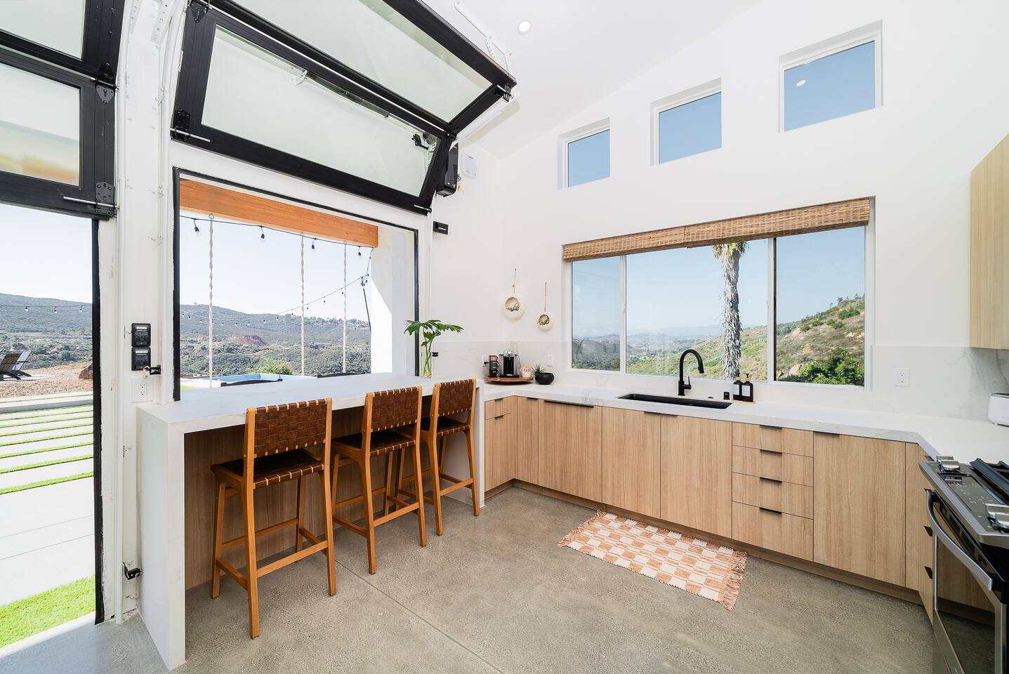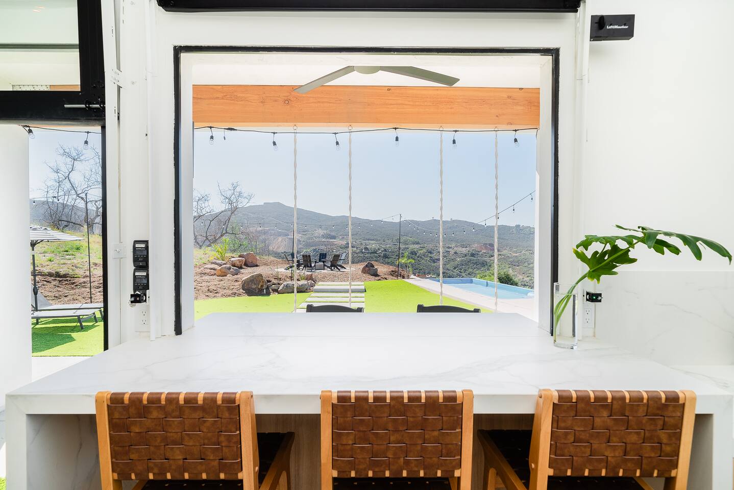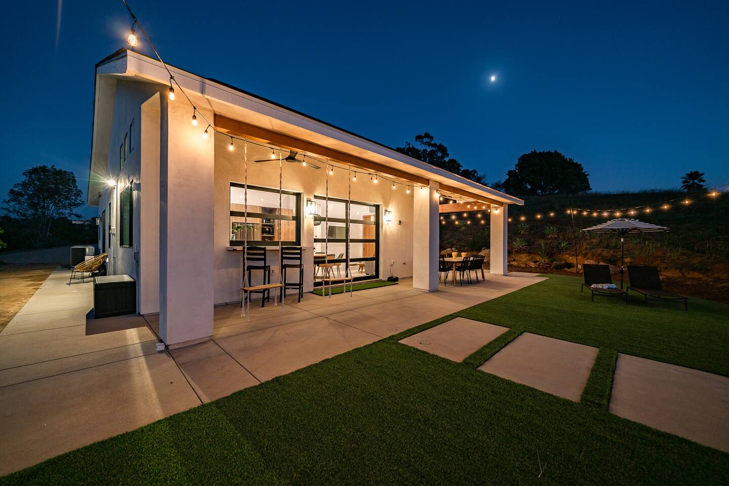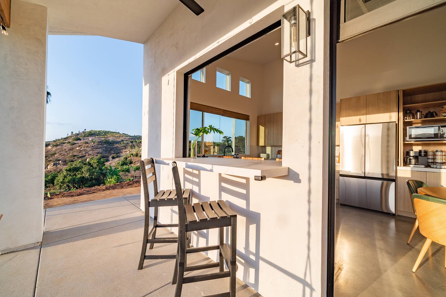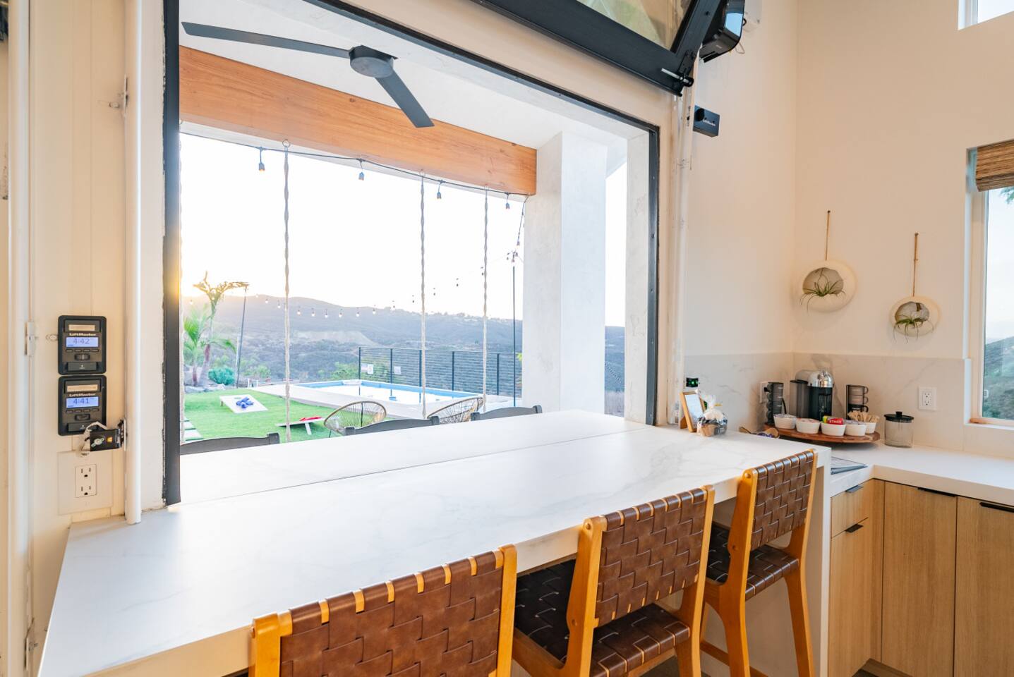 The Hideaway is where luxury meets nature, experience a truly unique retreat at our Vista property. Nestled away from the noise and stress of daily life, yet 15 minutes to amenities, this peaceful getaway is perfect for nature lovers and those in search of serenity. Escape the everyday and reconnect with the stunning beauty of the outdoors. It’s the ultimate “get away from it all” destination! *Can be booked with our 2 person unit on the same property for a total of 12 guests* (Inquire for details) **Featured on TV!** Vista Valley Hideaway caught the eye of real estate producer, Ty Hines, and our property was featured on SD Luxury Listings TV! Step inside and take in breathtaking panoramic views from the moment you arrive. The living room is a true showstopper, featuring a roll-up glass door that blurs the line between indoors and out—letting that perfect California sunshine and breeze flow right in. Outside, unwind on the covered patio, dive into the heated pool (kept at a comfy 78+-° during peak season at no extra charge, April–Oct, but can be heated during winter months for a small daily fee), or gather around the fire pit for starlit evenings and alfresco dining. Just 15 minutes from downtown, this pet-friendly oasis offers the perfect mix of relaxation, nature, and easy access to local fun. This open concept design allows people in the kitchen to connect with everybody in the dining area, living rooms, and even the outdoor spaces. Want to make a special meal for all of your guests? Enjoy all the amenities that this chef’s kitchen offers! Want to pass some appetizers out to the guests outside- no problem! The “pass through” servery kitchen window brings function and beauty to the space. You can choose to eat at the dining room table that seats 6, the servery window with bar stool seating that sits 6, and steps away you can take in the gorgeous views under the covered patio with an outdoor table that seats 8. This spacious vacation home offers three beautifully appointed bedrooms that all include 45” televisions. The master bedroom suite boasts a luxurious king-size bed, offering a regal night's sleep where you wake up to the beautiful surrounding mountain views! Take your freshly brewed cup of coffee right outside through the master bedrooms sliding glass doors and enjoy the outdoor furniture accompanying your bedroom suite. The en-suite master bathroom features a dual vanity, luxurious modern shower, and toilet room. The second bedroom features a comfortable queen-size bed, and the third bedroom is perfect for families with a full-size bunk bed that sleeps 4 children (or 2 adults) and a pullout twin trundle bed which sleeps 1 more, providing a cozy and efficient sleeping space. But the magic of this space extends beyond the bedrooms. Our living room and game room are versatile areas for relaxation and entertainment. Need extra sleeping options? No problem. The living room and game room both have pull-out queen-size sofa beds and we also have a full size air mattress. We can accommodate a total of 8 guests on the property comfortably. The game room, aka The Big Lebowski “Dude room”, features a pool table, Pac-Man machine, PlayStation 5, and board games; adding an extra layer of entertainment to your stay. And for the ultimate in relaxation, don't forget to unwind in the hot tub and pool, taking in the breathtaking surroundings. You'll love this private space! What are you waiting for? Come experience the perfect balance of nature and luxury at our Vista property today, where you can escape from it all and create memories to last a lifetime!