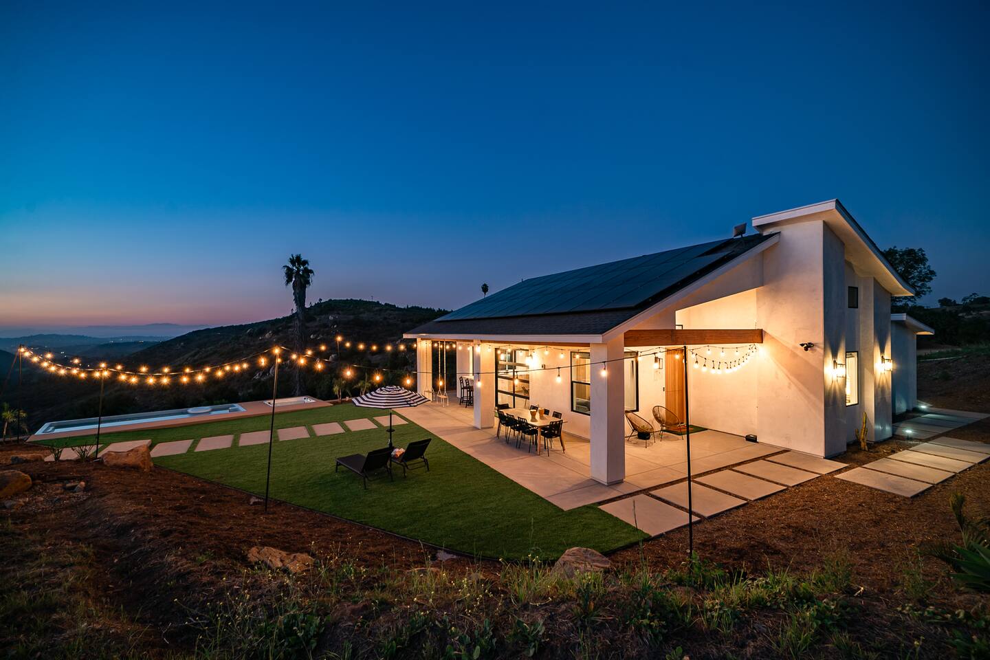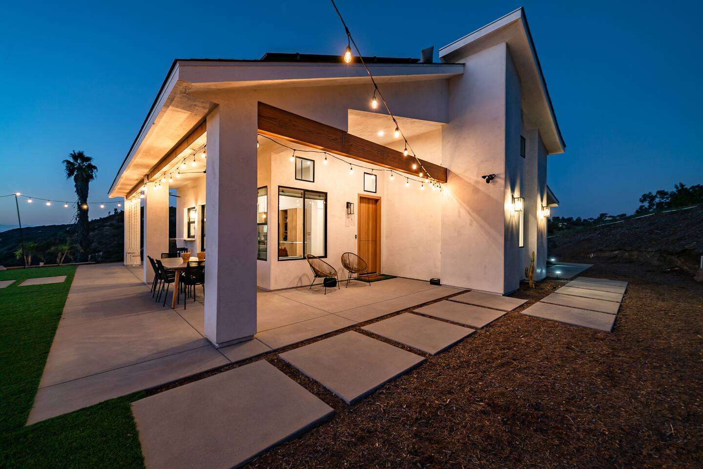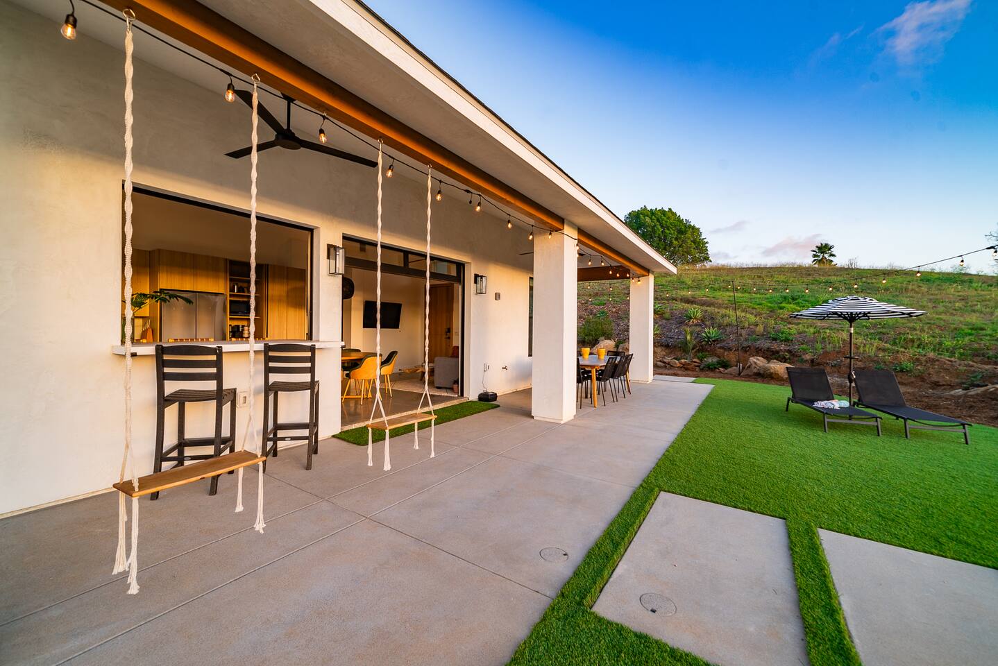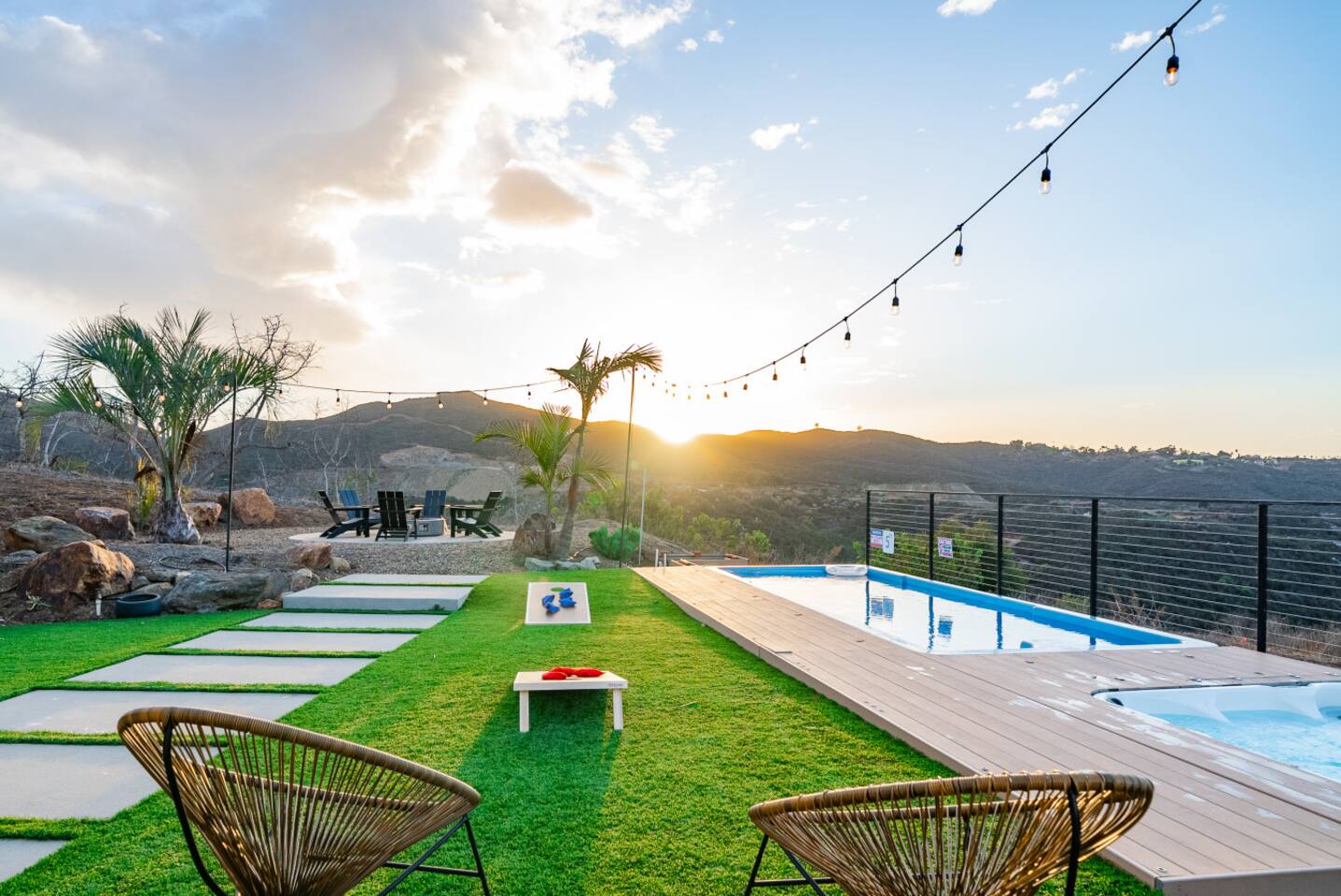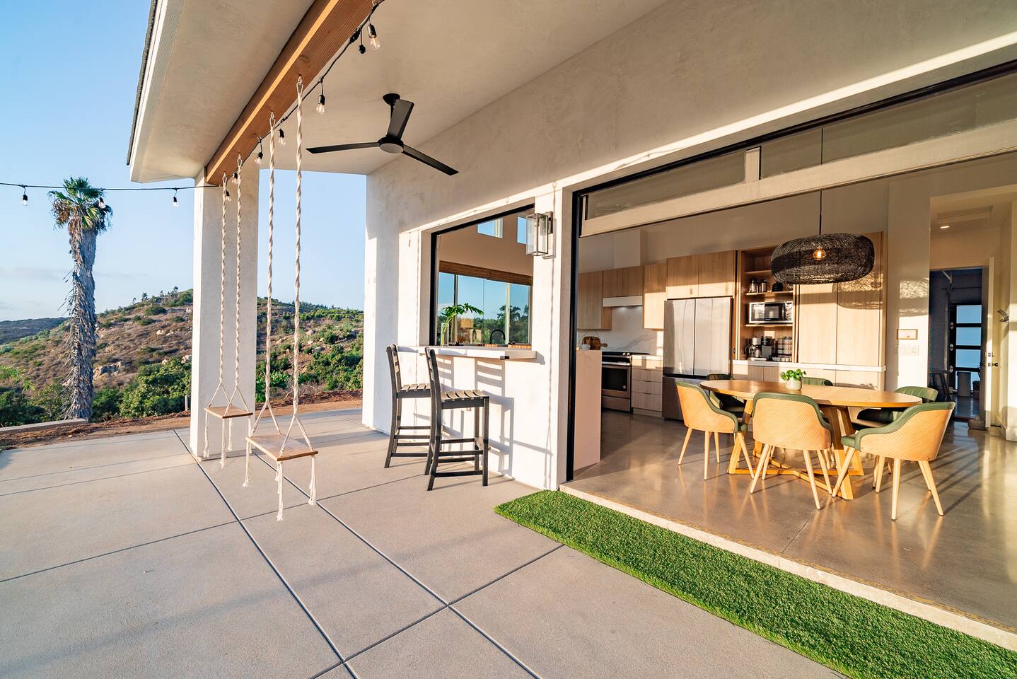 The Hideaway is where luxury meets nature, experience a truly unique retreat at our Vista property. Nestled away from the noise and stress of daily life, yet 15 minutes to amenities, this peaceful getaway is perfect for nature lovers and those in search of serenity. Escape the everyday and reconnect with the stunning beauty of the outdoors. It’s the ultimate “get away from it all” destination! *Can be booked with our 2 person unit on the same property for a total of 12 guests* (Inquire for details) **Featured on TV!** Vista Valley Hideaway caught the eye of real estate producer, Ty Hines, and our property was featured on SD Luxury Listings TV! Step inside and take in breathtaking panoramic views from the moment you arrive. The living room is a true showstopper, featuring a roll-up glass door that blurs the line between indoors and out—letting that perfect California sunshine and breeze flow right in. Outside, unwind on the covered patio, dive into the heated pool (kept at a comfy 78+-° during peak season at no extra charge, April–Oct, but can be heated during winter months for a small daily fee), or gather around the fire pit for starlit evenings and alfresco dining. Just 15 minutes from downtown, this pet-friendly oasis offers the perfect mix of relaxation, nature, and easy access to local fun. This open concept design allows people in the kitchen to connect with everybody in the dining area, living rooms, and even the outdoor spaces. Want to make a special meal for all of your guests? Enjoy all the amenities that this chef’s kitchen offers! Want to pass some appetizers out to the guests outside- no problem! The “pass through” servery kitchen window brings function and beauty to the space. You can choose to eat at the dining room table that seats 6, the servery window with bar stool seating that sits 6, and steps away you can take in the gorgeous views under the covered patio with an outdoor table that seats 8. This spacious vacation home offers three beautifully appointed bedrooms that all include 45” televisions. The master bedroom suite boasts a luxurious king-size bed, offering a regal night's sleep where you wake up to the beautiful surrounding mountain views! Take your freshly brewed cup of coffee right outside through the master bedrooms sliding glass doors and enjoy the outdoor furniture accompanying your bedroom suite. The en-suite master bathroom features a dual vanity, luxurious modern shower, and toilet room. The second bedroom features a comfortable queen-size bed, and the third bedroom is perfect for families with a full-size bunk bed that sleeps 4 children (or 2 adults) and a pullout twin trundle bed which sleeps 1 more, providing a cozy and efficient sleeping space. But the magic of this space extends beyond the bedrooms. Our living room and game room are versatile areas for relaxation and entertainment. Need extra sleeping options? No problem. The living room and game room both have pull-out queen-size sofa beds and we also have a full size air mattress. We can accommodate a total of 8 guests on the property comfortably. The game room, aka The Big Lebowski “Dude room”, features a pool table, Pac-Man machine, PlayStation 5, and board games; adding an extra layer of entertainment to your stay. And for the ultimate in relaxation, don't forget to unwind in the hot tub and pool, taking in the breathtaking surroundings. You'll love this private space! What are you waiting for? Come experience the perfect balance of nature and luxury at our Vista property today, where you can escape from it all and create memories to last a lifetime!