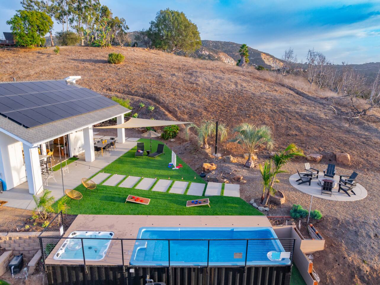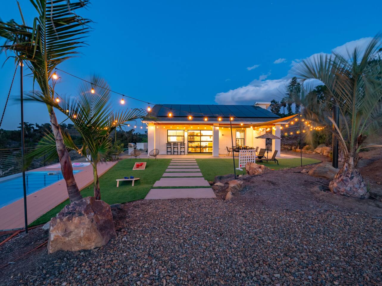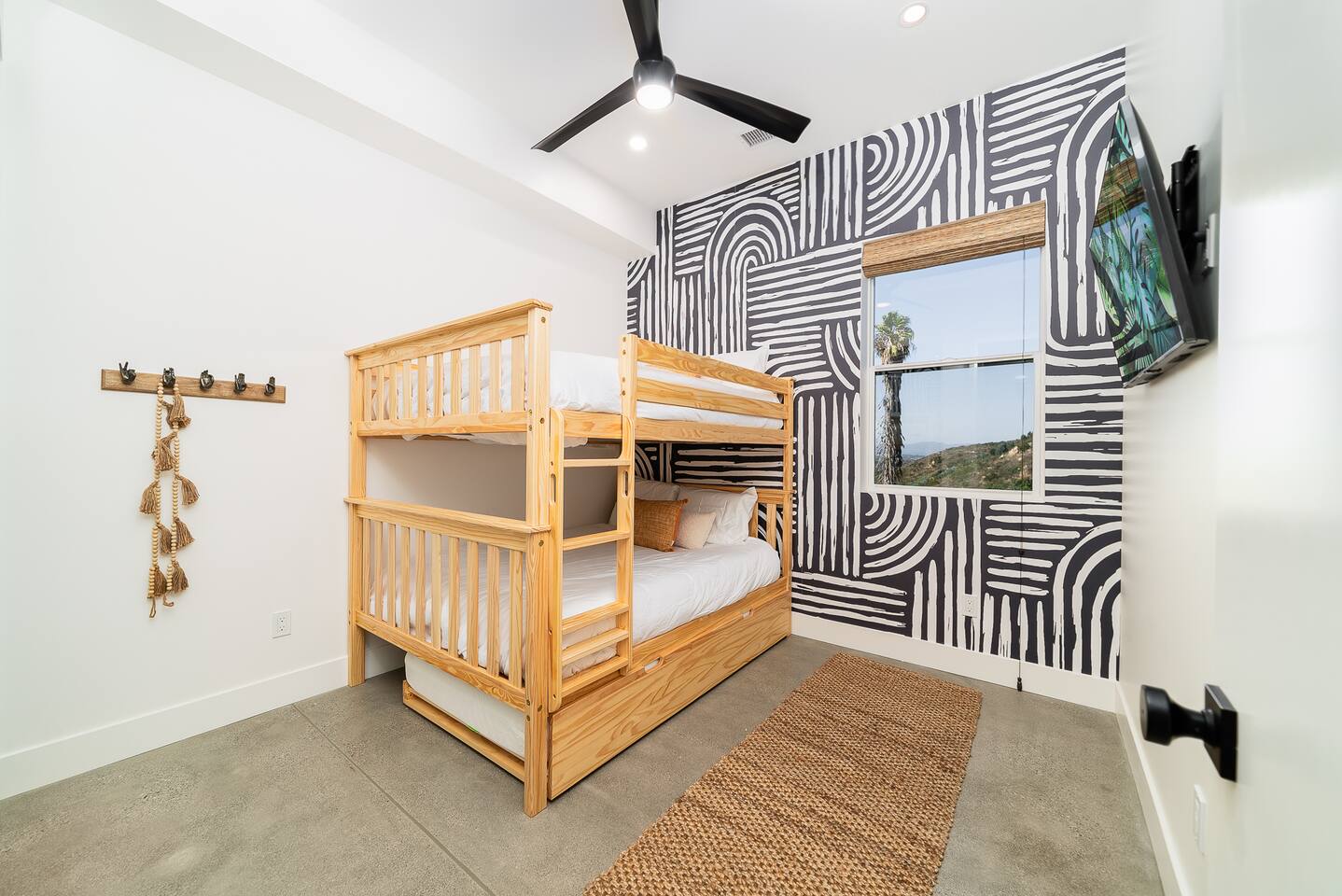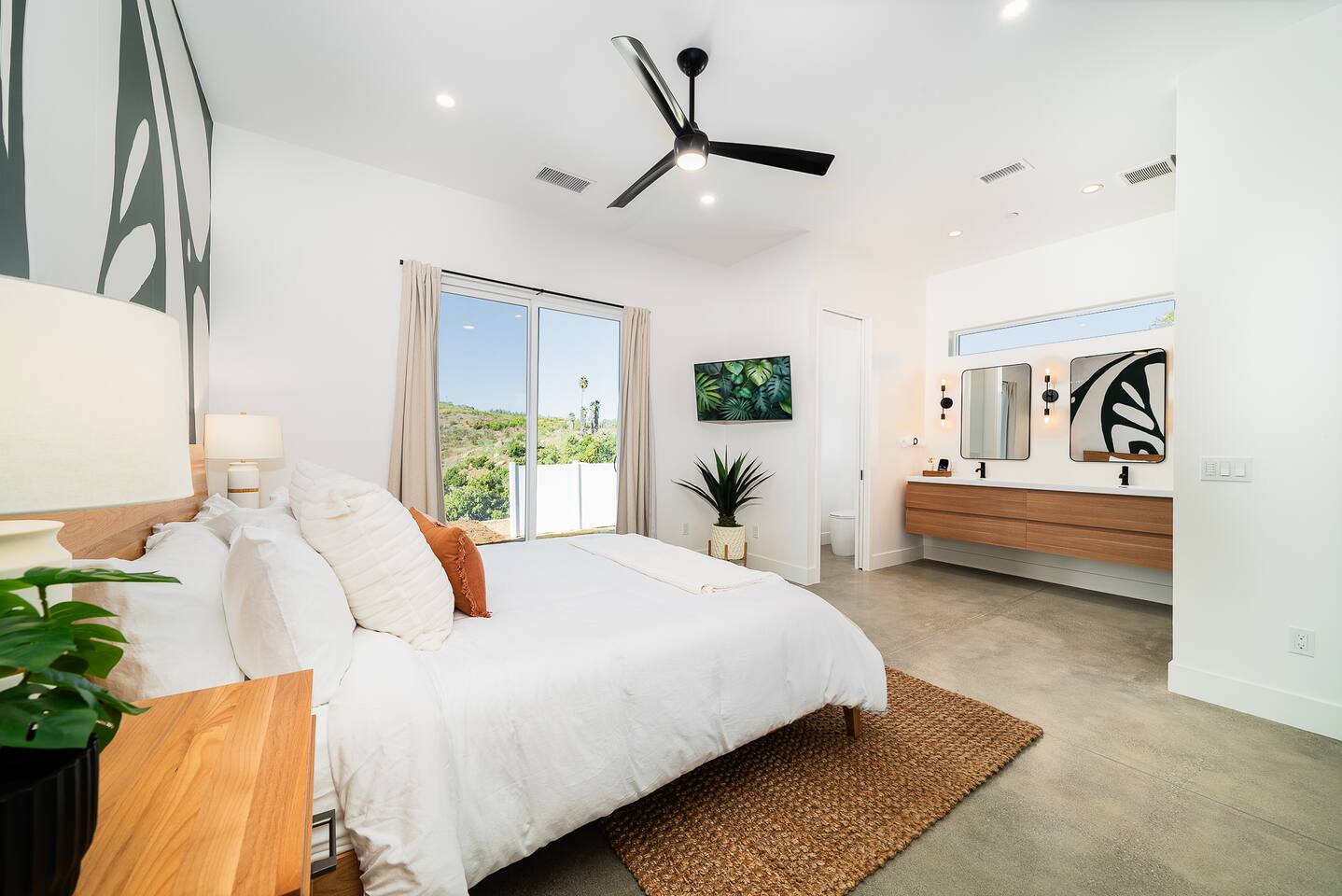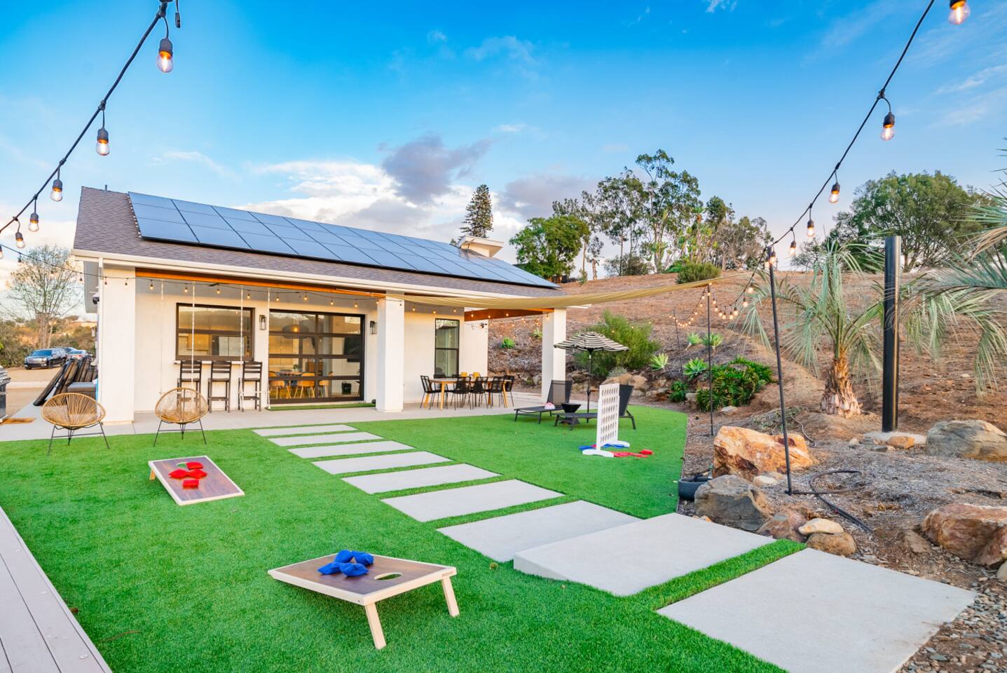 The Hideaway is where luxury meets nature, experience a truly unique retreat at our Vista property. Nestled away from the noise and stress of daily life, yet 15 minutes to amenities, this peaceful getaway is perfect for nature lovers and those in search of serenity. Escape the everyday and reconnect with the stunning beauty of the outdoors. It’s the ultimate “get away from it all” destination! *Can be booked with our 2 person unit on the same property for a total of 12 guests* (Inquire for details) **Featured on TV!** Vista Valley Hideaway caught the eye of real estate producer, Ty Hines, and our property was featured on SD Luxury Listings TV! Step inside and take in breathtaking panoramic views from the moment you arrive. The living room is a true showstopper, featuring a roll-up glass door that blurs the line between indoors and out—letting that perfect California sunshine and breeze flow right in. Outside, unwind on the covered patio, dive into the heated pool (kept at a comfy 78+-° during peak season at no extra charge, April–Oct, but can be heated during winter months for a small daily fee), or gather around the fire pit for starlit evenings and alfresco dining. Just 15 minutes from downtown, this pet-friendly oasis offers the perfect mix of relaxation, nature, and easy access to local fun. This open concept design allows people in the kitchen to connect with everybody in the dining area, living rooms, and even the outdoor spaces. Want to make a special meal for all of your guests? Enjoy all the amenities that this chef’s kitchen offers! Want to pass some appetizers out to the guests outside- no problem! The “pass through” servery kitchen window brings function and beauty to the space. You can choose to eat at the dining room table that seats 6, the servery window with bar stool seating that sits 6, and steps away you can take in the gorgeous views under the covered patio with an outdoor table that seats 8. This spacious vacation home offers three beautifully appointed bedrooms that all include 45” televisions. The master bedroom suite boasts a luxurious king-size bed, offering a regal night's sleep where you wake up to the beautiful surrounding mountain views! Take your freshly brewed cup of coffee right outside through the master bedrooms sliding glass doors and enjoy the outdoor furniture accompanying your bedroom suite. The en-suite master bathroom features a dual vanity, luxurious modern shower, and toilet room. The second bedroom features a comfortable queen-size bed, and the third bedroom is perfect for families with a full-size bunk bed that sleeps 4 children (or 2 adults) and a pullout twin trundle bed which sleeps 1 more, providing a cozy and efficient sleeping space. But the magic of this space extends beyond the bedrooms. Our living room and game room are versatile areas for relaxation and entertainment. Need extra sleeping options? No problem. The living room and game room both have pull-out queen-size sofa beds and we also have a full size air mattress. We can accommodate a total of 8 guests on the property comfortably. The game room, aka The Big Lebowski “Dude room”, features a pool table, Pac-Man machine, PlayStation 5, and board games; adding an extra layer of entertainment to your stay. And for the ultimate in relaxation, don't forget to unwind in the hot tub and pool, taking in the breathtaking surroundings. You'll love this private space! What are you waiting for? Come experience the perfect balance of nature and luxury at our Vista property today, where you can escape from it all and create memories to last a lifetime!