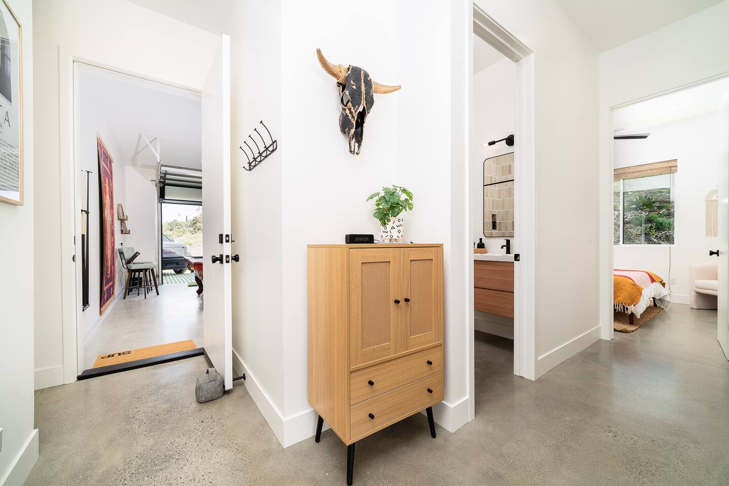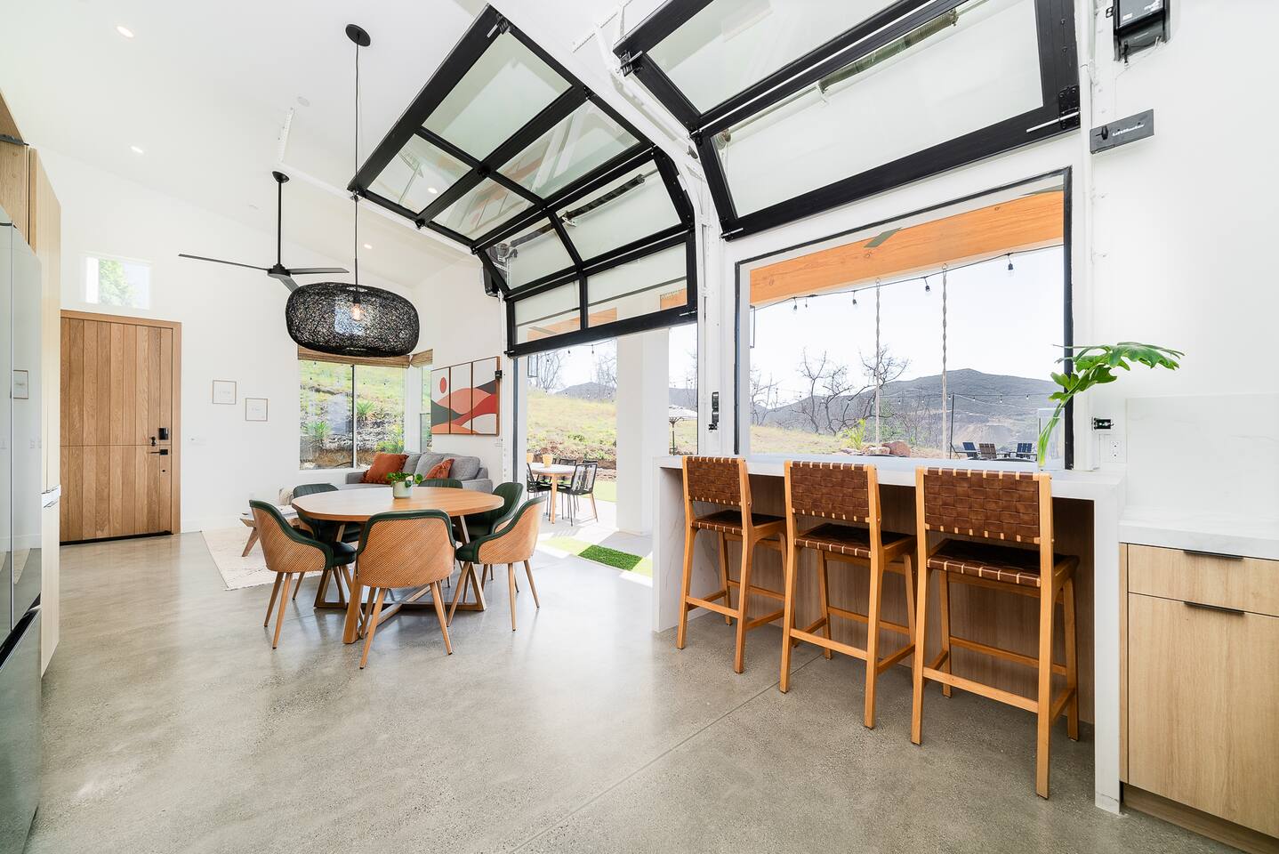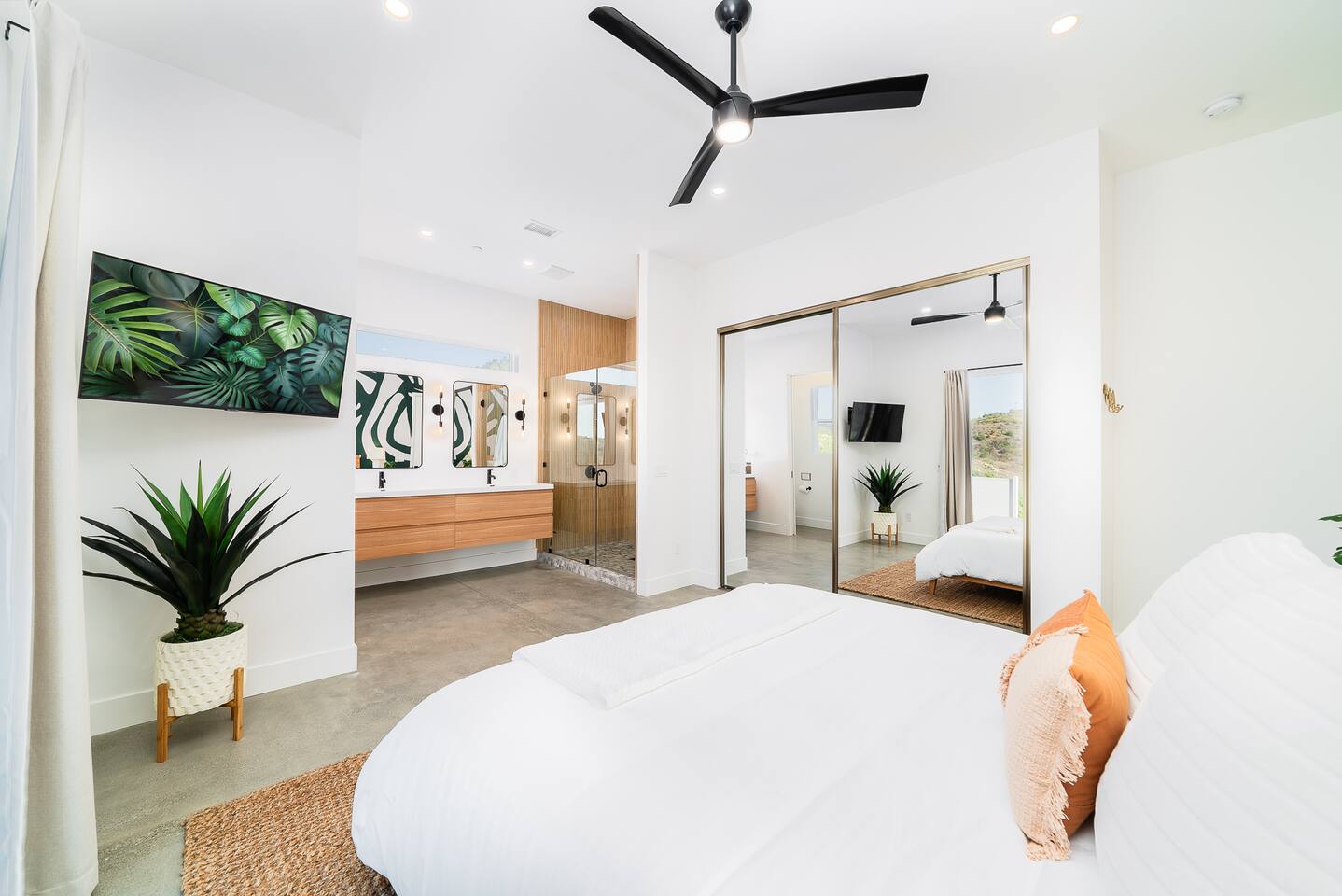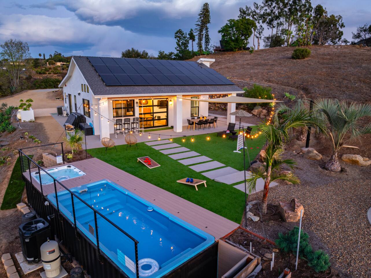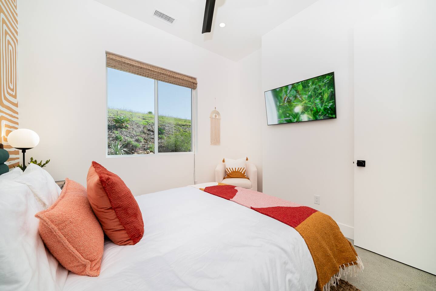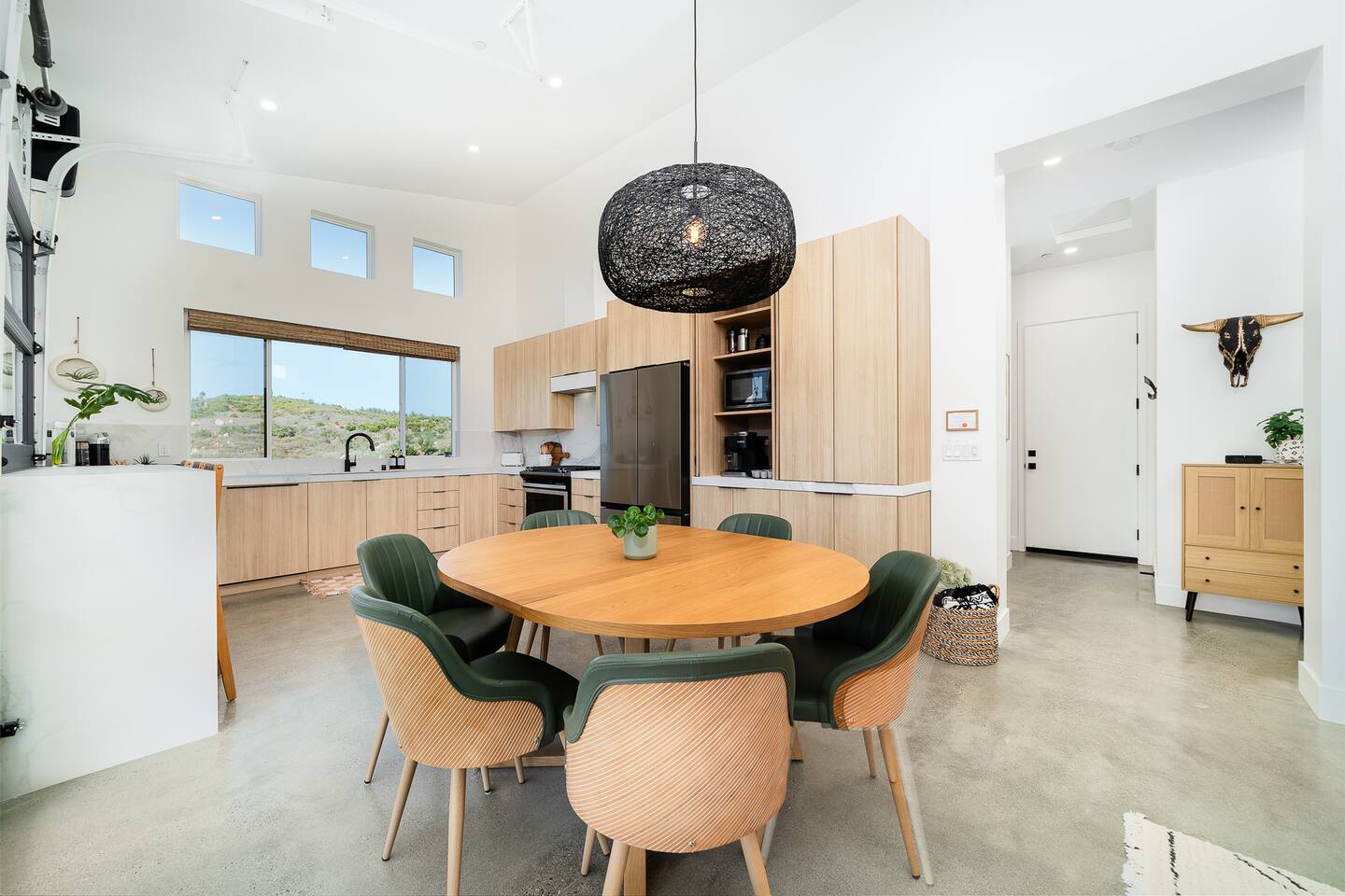 The Hideaway is where luxury meets nature, experience a truly unique retreat at our Vista property. Nestled away from the noise and stress of daily life, yet 15 minutes to amenities, this peaceful getaway is perfect for nature lovers and those in search of serenity. Escape the everyday and reconnect with the stunning beauty of the outdoors. It’s the ultimate “get away from it all” destination! *Can be booked with our 2 person unit on the same property for a total of 12 guests* (Inquire for details) **Featured on TV!** Vista Valley Hideaway caught the eye of real estate producer, Ty Hines, and our property was featured on SD Luxury Listings TV! Step inside and take in breathtaking panoramic views from the moment you arrive. The living room is a true showstopper, featuring a roll-up glass door that blurs the line between indoors and out—letting that perfect California sunshine and breeze flow right in. Outside, unwind on the covered patio, dive into the heated pool (kept at a comfy 78+-° during peak season at no extra charge, April–Oct, but can be heated during winter months for a small daily fee), or gather around the fire pit for starlit evenings and alfresco dining. Just 15 minutes from downtown, this pet-friendly oasis offers the perfect mix of relaxation, nature, and easy access to local fun. This open concept design allows people in the kitchen to connect with everybody in the dining area, living rooms, and even the outdoor spaces. Want to make a special meal for all of your guests? Enjoy all the amenities that this chef’s kitchen offers! Want to pass some appetizers out to the guests outside- no problem! The “pass through” servery kitchen window brings function and beauty to the space. You can choose to eat at the dining room table that seats 6, the servery window with bar stool seating that sits 6, and steps away you can take in the gorgeous views under the covered patio with an outdoor table that seats 8. This spacious vacation home offers three beautifully appointed bedrooms that all include 45” televisions. The master bedroom suite boasts a luxurious king-size bed, offering a regal night's sleep where you wake up to the beautiful surrounding mountain views! Take your freshly brewed cup of coffee right outside through the master bedrooms sliding glass doors and enjoy the outdoor furniture accompanying your bedroom suite. The en-suite master bathroom features a dual vanity, luxurious modern shower, and toilet room. The second bedroom features a comfortable queen-size bed, and the third bedroom is perfect for families with a full-size bunk bed that sleeps 4 children (or 2 adults) and a pullout twin trundle bed which sleeps 1 more, providing a cozy and efficient sleeping space. But the magic of this space extends beyond the bedrooms. Our living room and game room are versatile areas for relaxation and entertainment. Need extra sleeping options? No problem. The living room and game room both have pull-out queen-size sofa beds and we also have a full size air mattress. We can accommodate a total of 8 guests on the property comfortably. The game room, aka The Big Lebowski “Dude room”, features a pool table, Pac-Man machine, PlayStation 5, and board games; adding an extra layer of entertainment to your stay. And for the ultimate in relaxation, don't forget to unwind in the hot tub and pool, taking in the breathtaking surroundings. You'll love this private space! What are you waiting for? Come experience the perfect balance of nature and luxury at our Vista property today, where you can escape from it all and create memories to last a lifetime!